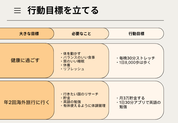 大きな目標を立てたら、それを達成するために具体的に何をするのかを考えていきましょう!