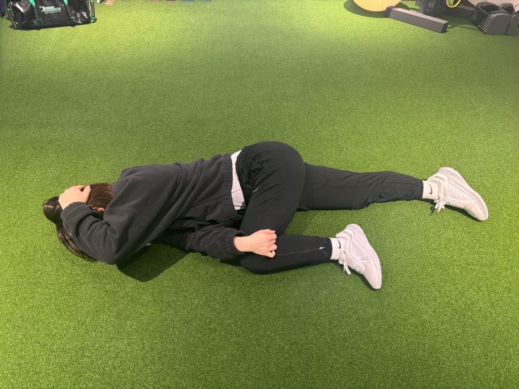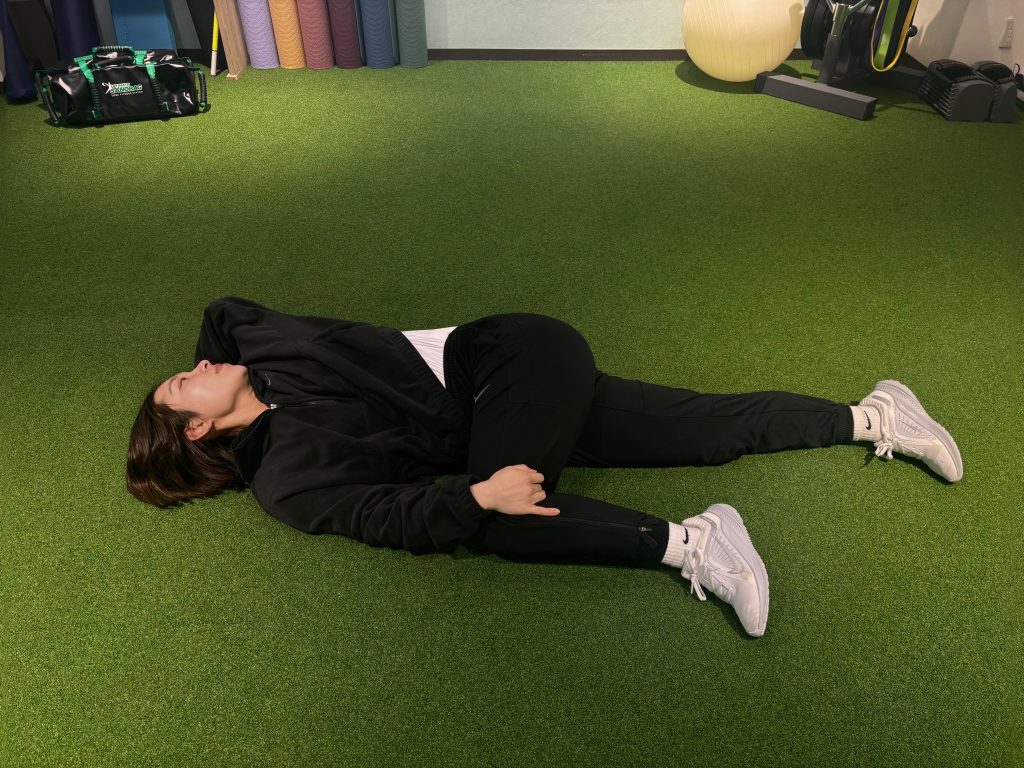 - 仰向けに寝て両膝を立て、片足を反対の太ももの上に乗せる(4の字の形)