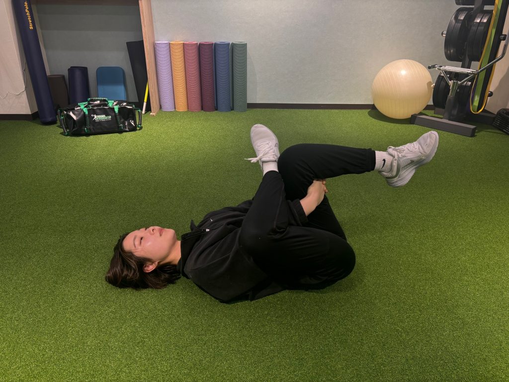 - 太もも裏を両手で抱え、膝を胸の方へ引き寄せる