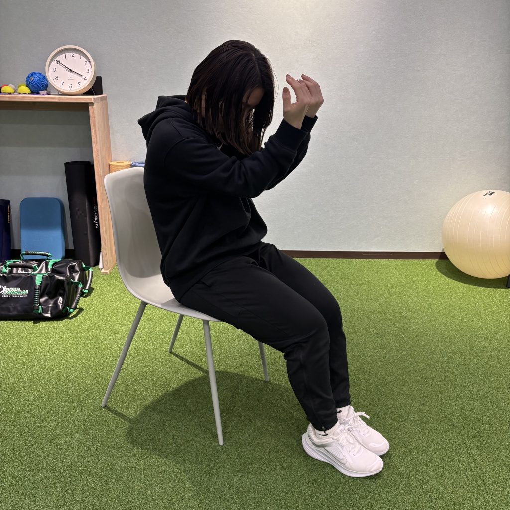 ①両肘を顔の前でくっつけながら、おへそを引きこみ背中を丸める