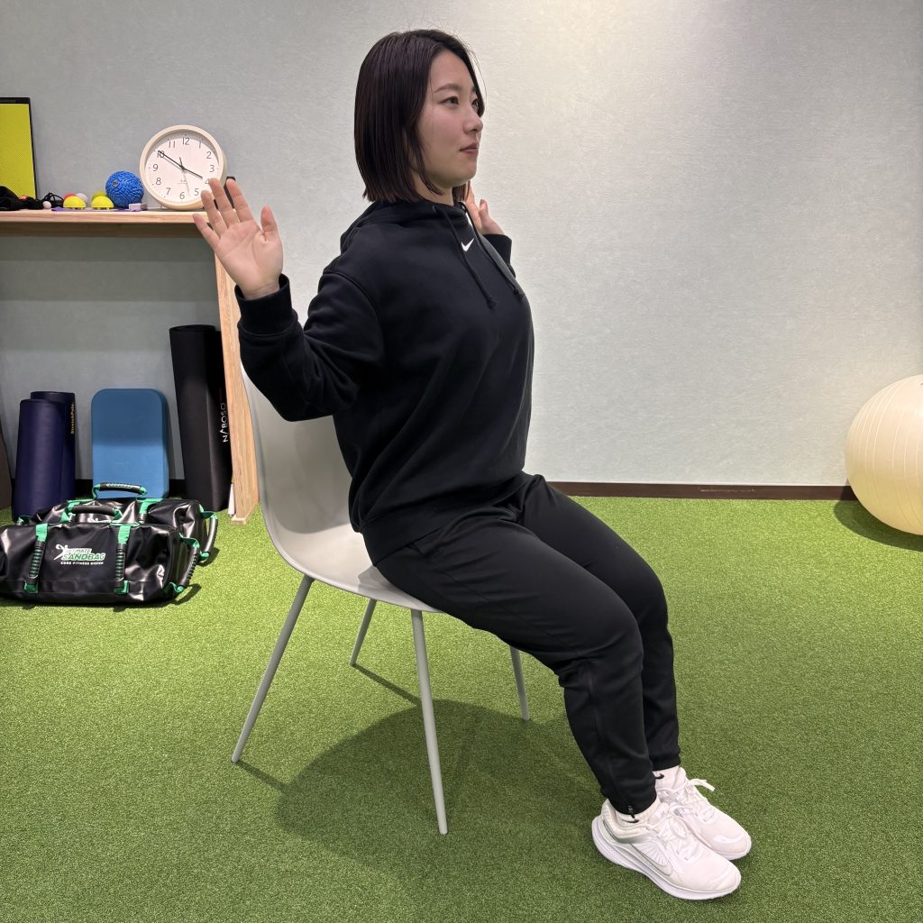 ②肩甲骨を寄せながら胸を開き、背骨をまっすぐ起こす