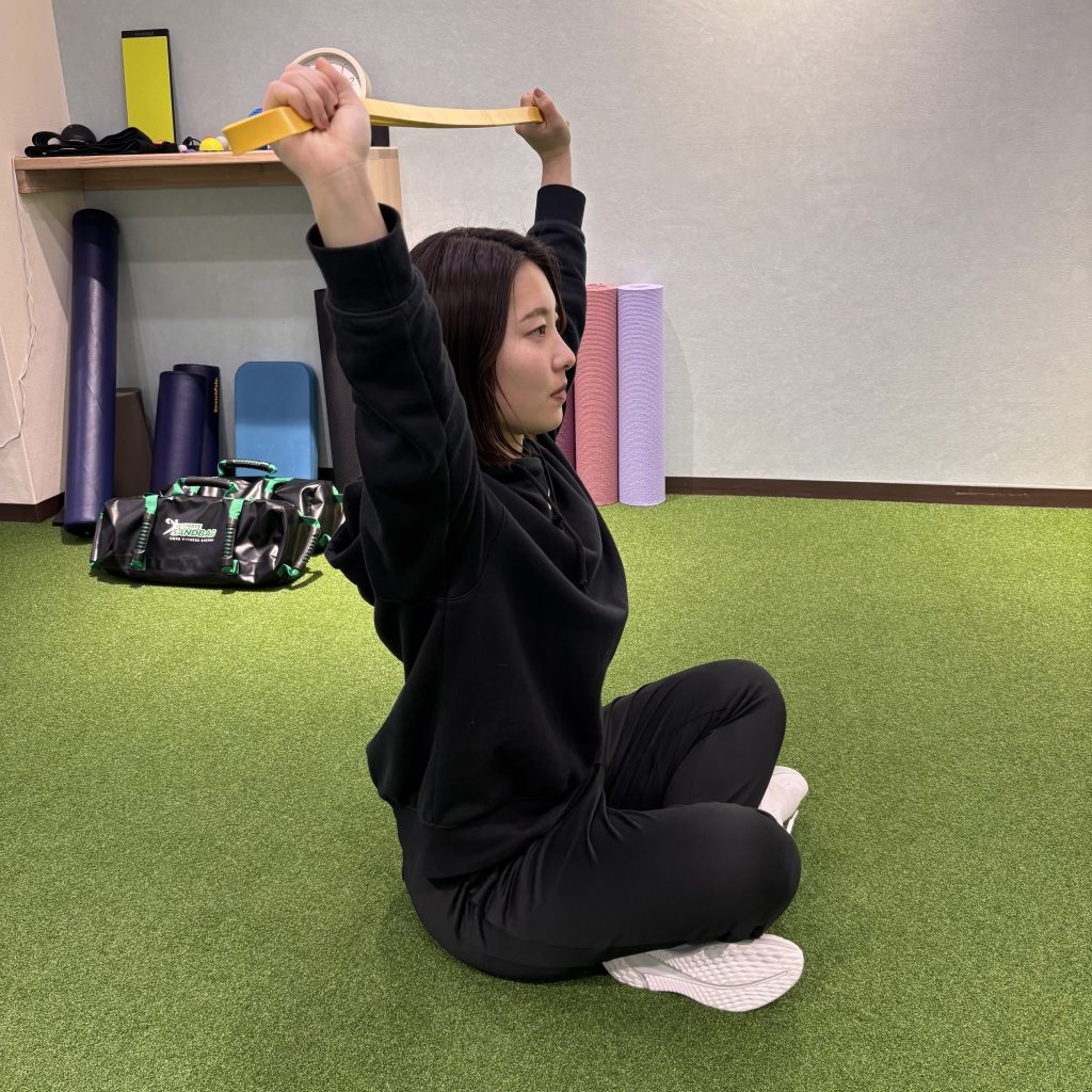 ①あぐらで座り、肘が耳の横に来るよう両手を上げる(タオルを使って実施してみましょう)