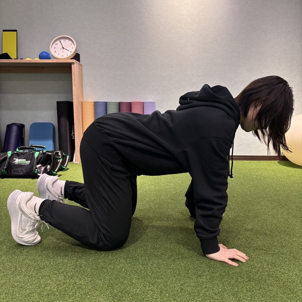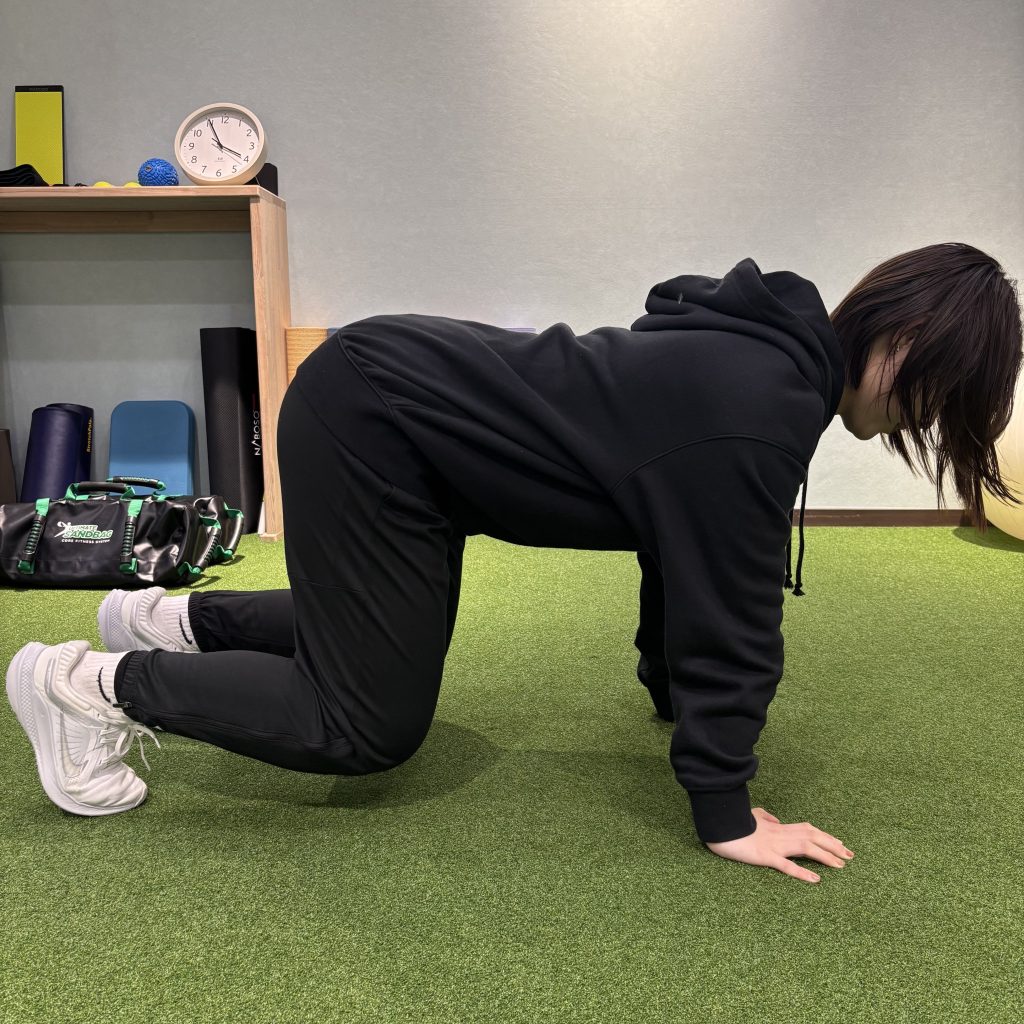 ①肩甲骨の下に手、骨盤の下に膝をつき、背骨をまっすぐに保つ