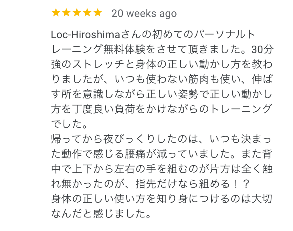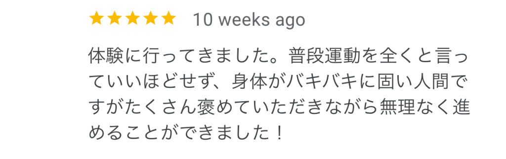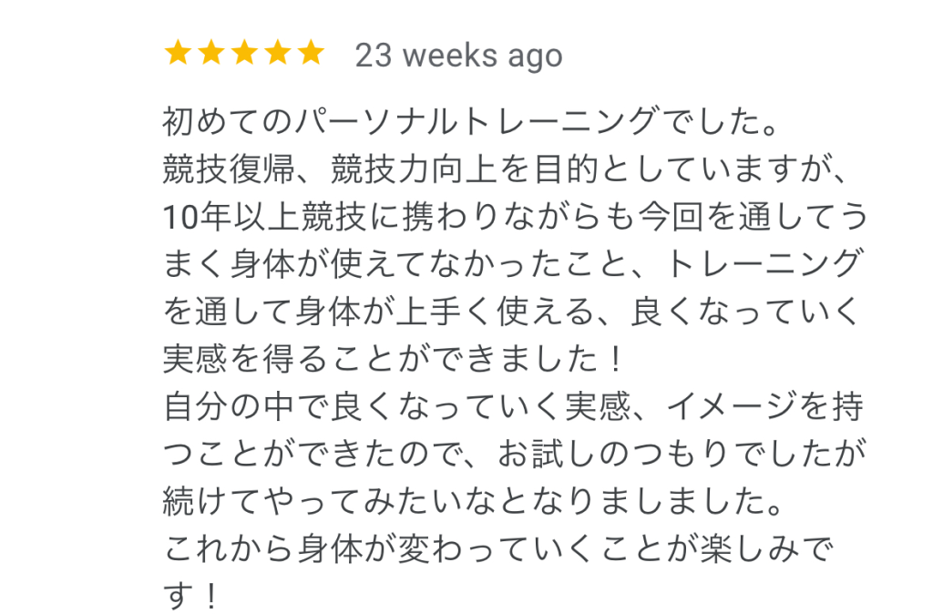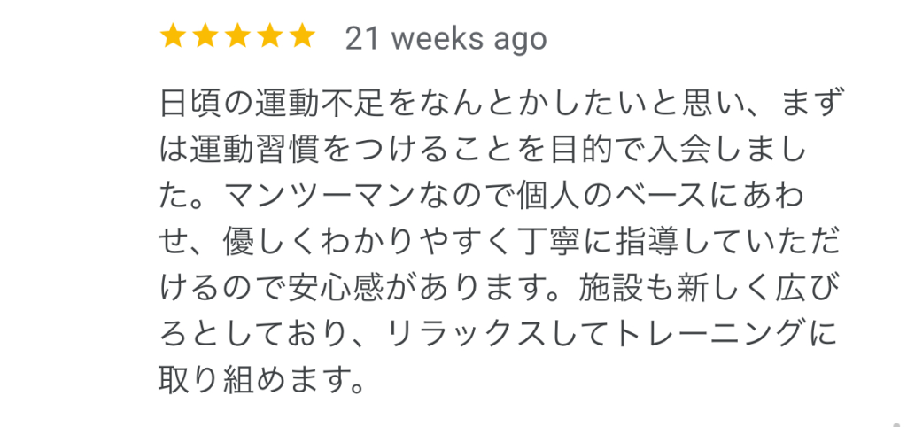 ちょうどいい負荷でトレーニングメニューを考えてくださるので、しんどすぎず楽すぎず、次もまた頑張ろう!という気持ちで毎回通うことができています!自分1人だとやりすぎてしまったり、楽をしすぎてしまうので、プロの方に教えてもらう方が私には向いていると思います。