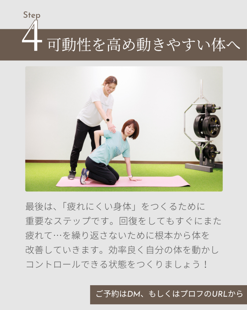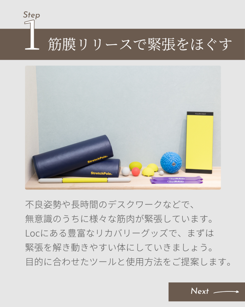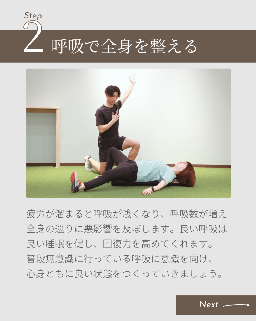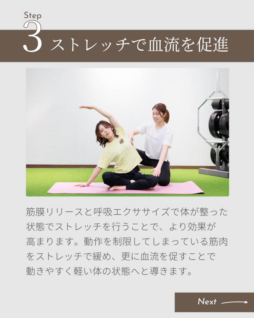 【筋膜リリース】【呼吸エクササイズ】【ストレッチ】【可動性向上エクササイズ】と、4つの段階を踏んで効率的に回復力を高め、体を整えていきます。